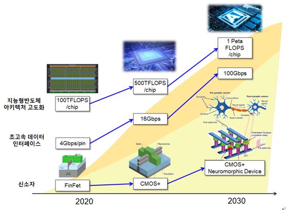 - 지능형반도체를 구현하기 위해서는 지능형반도체 아키텍처 고도화에 따른 초고속 연산능력, 대용량의 데이터를 저장하고 엑세스하며 스스로 변형하여 학습할 수 있는 초고속 데이터 인터페이스가 개발되고 이를 실현하는 데 최적화된 새로운 반도체 소자 개발이 필요함