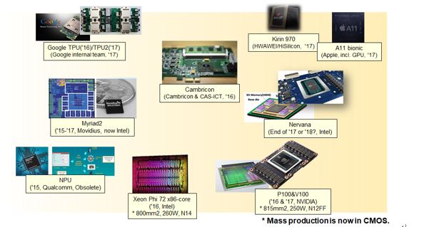 - 인공지능 컴퓨팅, 특히 딥러닝의 효율성을 요구하는 인공신경망 어플리케이션의 발전에 따라서 2017년 이래 CMOS 기술을 기반으로 하는 인공지능 반도체 상용화 기술이 다수 등장하고 있으며, 일부는 과학연구 및 모바일 분야에서 상용화