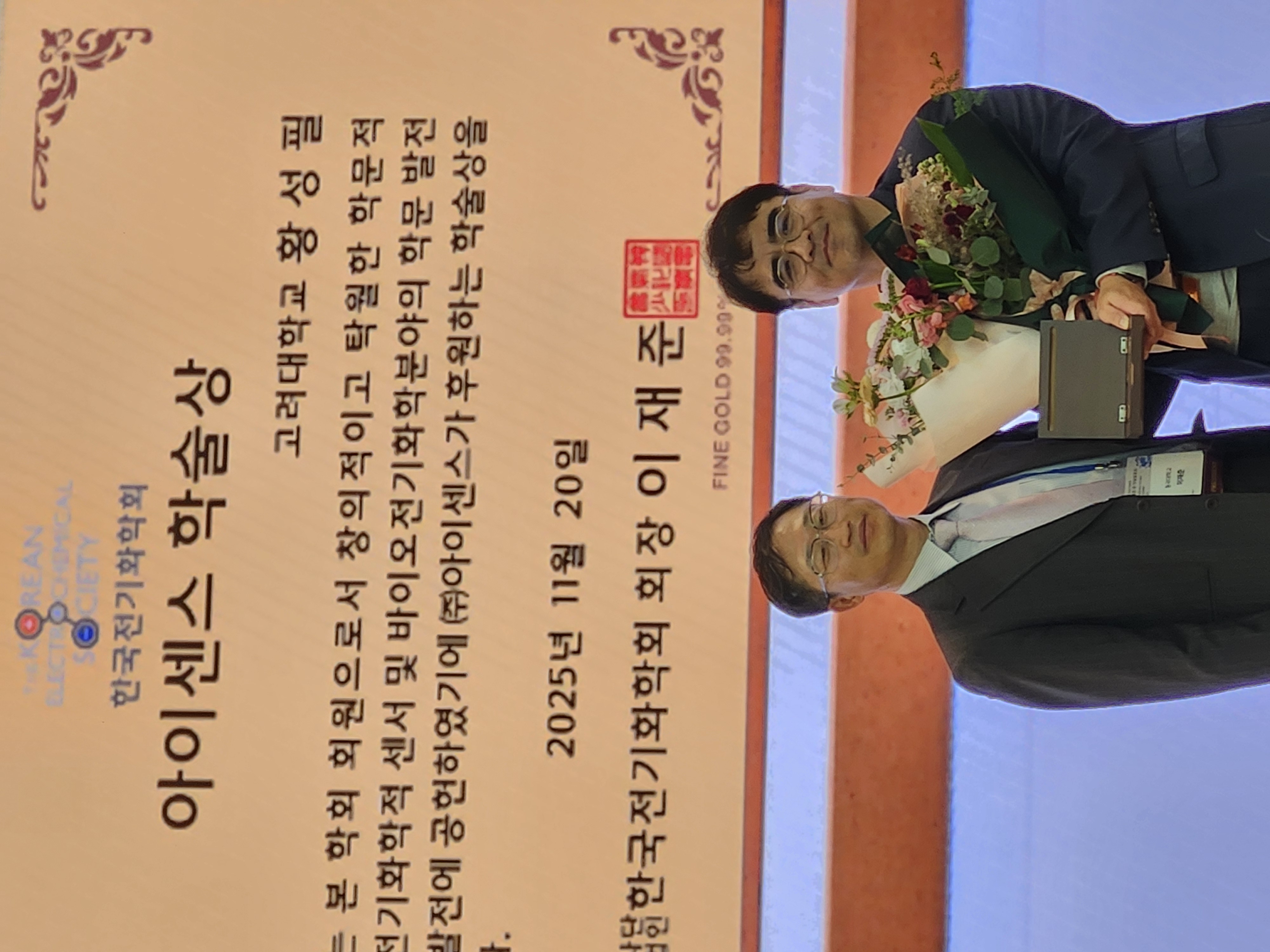 “艾森斯学术奖”是由艾森斯株式会社每年捐资设立,授予在电化学传感器及生物电化学领域中对学术与技术发展作出突出贡献的研究者,是电化学领域的重要奖项。本次颁奖活动由韩国电化学会主办,黄成弼(音)教授随后还将在物理电化学分会进行获奖纪念演讲。