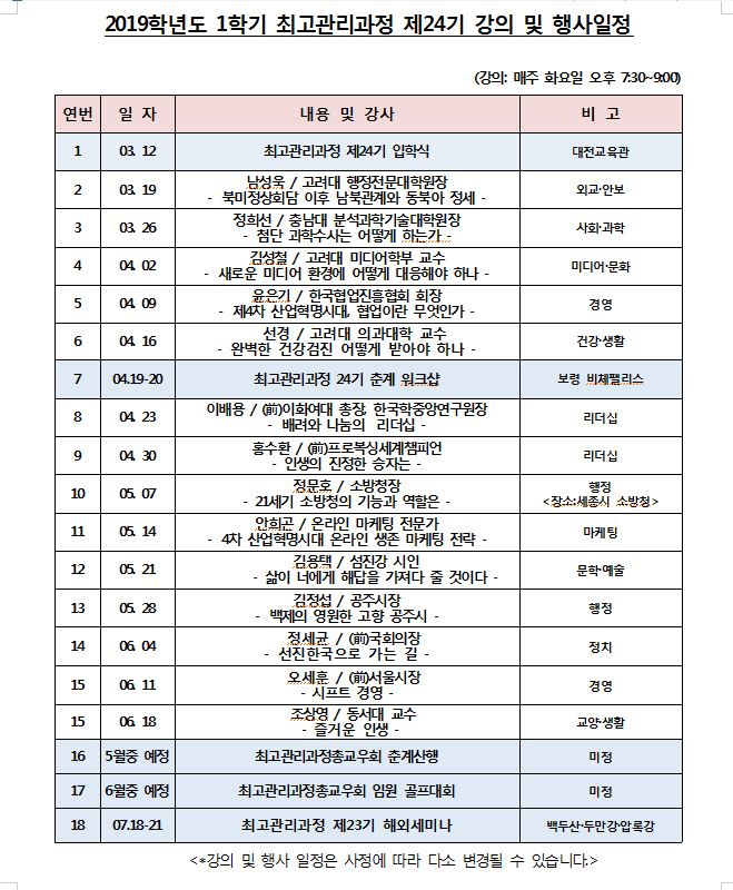 [안내] 2019학년도 최고관리과정 제24기 1학기 학사일정