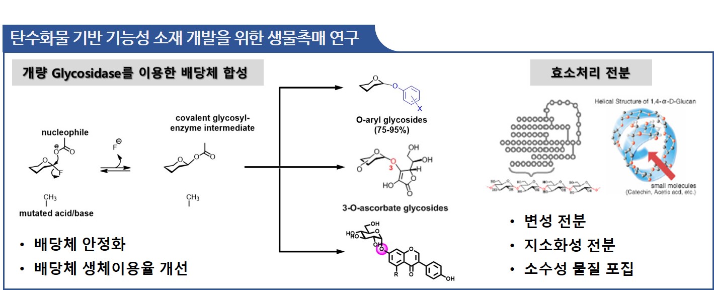 영양원으로서의 기능을 하는 단당류는 다른 당 또는 천연물에 연결되면서 당의 조성이나 결합구조에 따라 매우 기능성을 나타낸다. 본 연구실은 올리고당이나 배당체를 합성할 수 있는 효소를 개발함으로써 새로운 탄수화물 기반 신소재 개발을 목표로 연구를 하고 있다. 현재는 플라보노이드 배당체의 생체이용율 개선을 위해서 섭취 후 소화효소에 의해서 대사되는 당쇄를 가지는 배당체 합성 및 이를 위한 효소 개발 연구를 진행하고 있다.