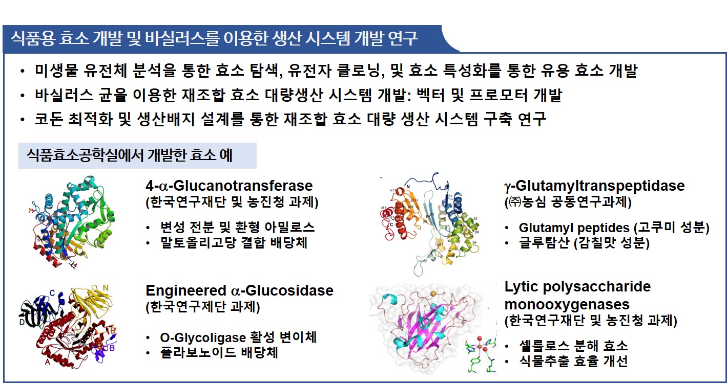효소의 산업적 생산을 위해서는 재조합 기술이 필수적이다. 식품에 사용되는 재조합 단백질의 안전성 문제를 해결하기 위해서는 재조합 단백질을 만드는 생산시스템의 안전성이 무엇보다도 중요하다. 본 연구실은 안전성이 담보된 바실러스 균을 이용하여 식품용 재조합 단백질을 생산하기 위하여 발현벡터 제작 및 대량생산을 위한 프로모터 개발 연구를 진행하고 있다.