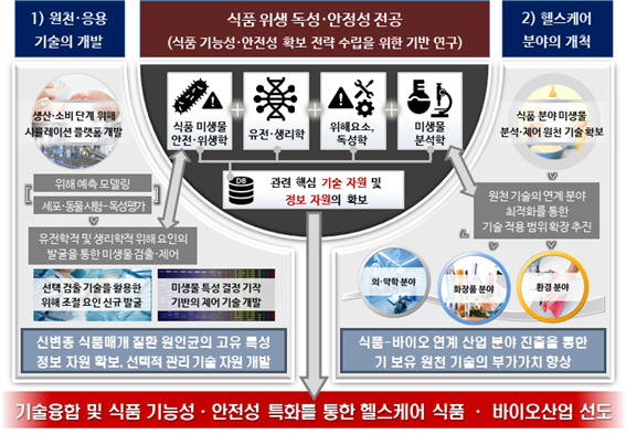 - 미생물 생장·대사·환경저항성·사멸·교차오염 등 고유 특성 분석을 기반으로 한 검출·살균 등 위해 예방·제어 기술 개발